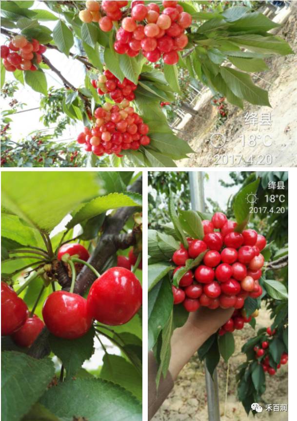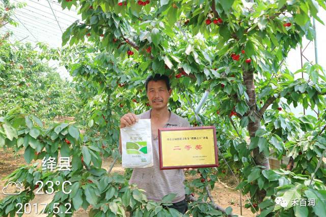 5月份,我们再次回访了山西绛县的农户董阿伯,得知自4月份樱桃提前一周上市以来,已成熟的樱桃已全部被采摘、售罄! 董阿伯乐呵呵地告诉我们,用了禾百润之后,樱桃提前一周成熟,他所有成熟了的樱桃都卖得很好,现在别人的园子才刚开园! 今年的樱桃单重11-12g,糖度达到21-22,去年大棚里一亩八分地收入约13万,今年期望会刷上新高! 在今年3月份的时候,董阿伯第一次给樱桃用禾百润和朴露芬,使用三次之后,在4月下旬,樱桃提前一周成熟了,产量高,品质优良,色泽红润,味道甜美,受到消费者的热烈追捧,供不应求! 我们来看看董阿伯种出来的红彤彤的大樱桃! 具体生长过程我们在上一篇文章中已记录(点击此处回顾) 禾百润李总与农户阿伯的合照 今年不仅樱桃的产量高,品质好, 董阿伯还获得了山西绛县首届樱桃文化节的“樱桃之王”评选的二等奖!喜欢吃樱桃的消费者络绎不绝,亲自到园里去采摘新鲜的大樱桃! 在这里,禾百润衷心祝贺山西绛县的董阿伯今年获得如此丰硕的成果!以后我们会继续给广大农户研发出更多天然优质的产品,让每位农户都硕果累累,获得大丰收!